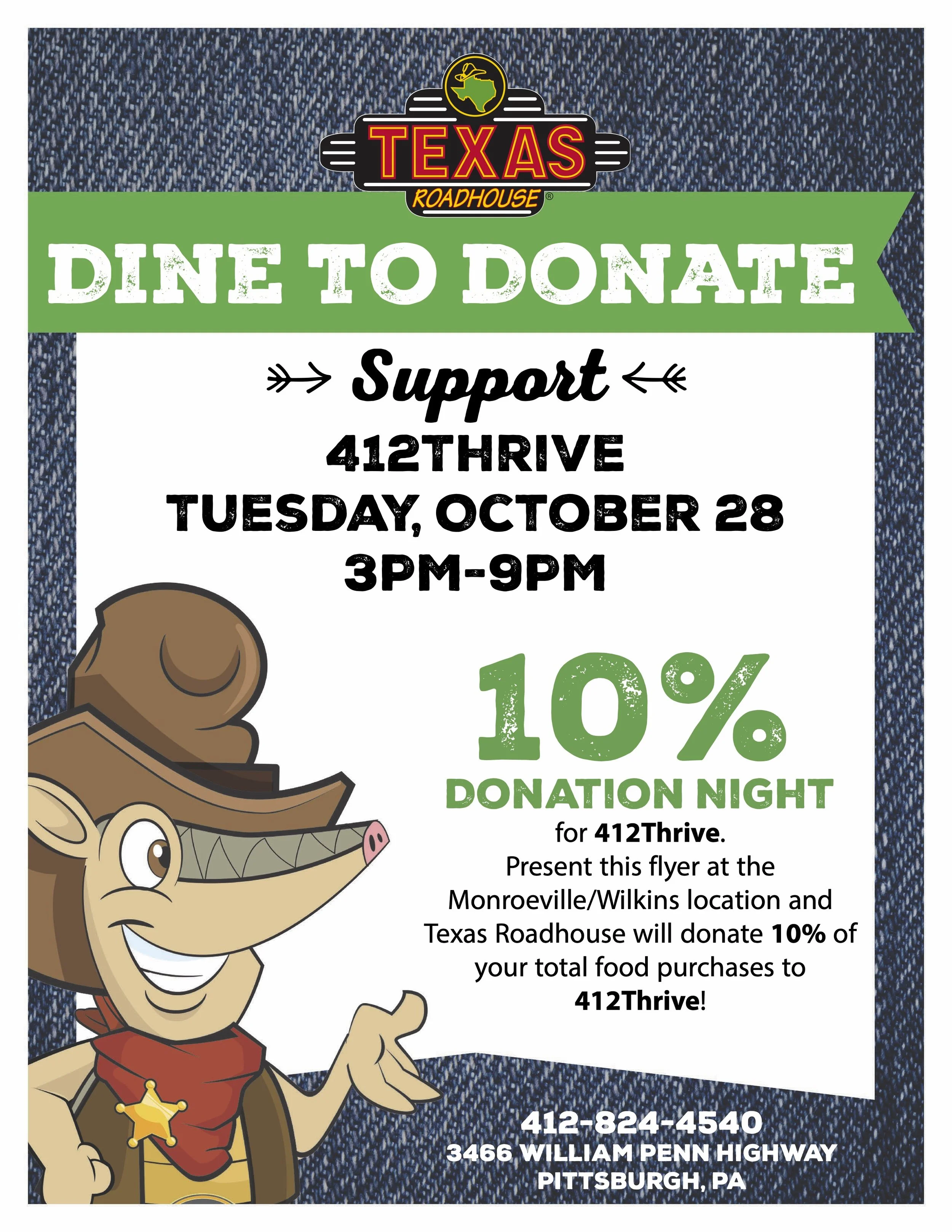 Show your server this flyer, and 10% of your meal will be donated back to 412Thrive. These funds go directly into our Thriver Care Packages