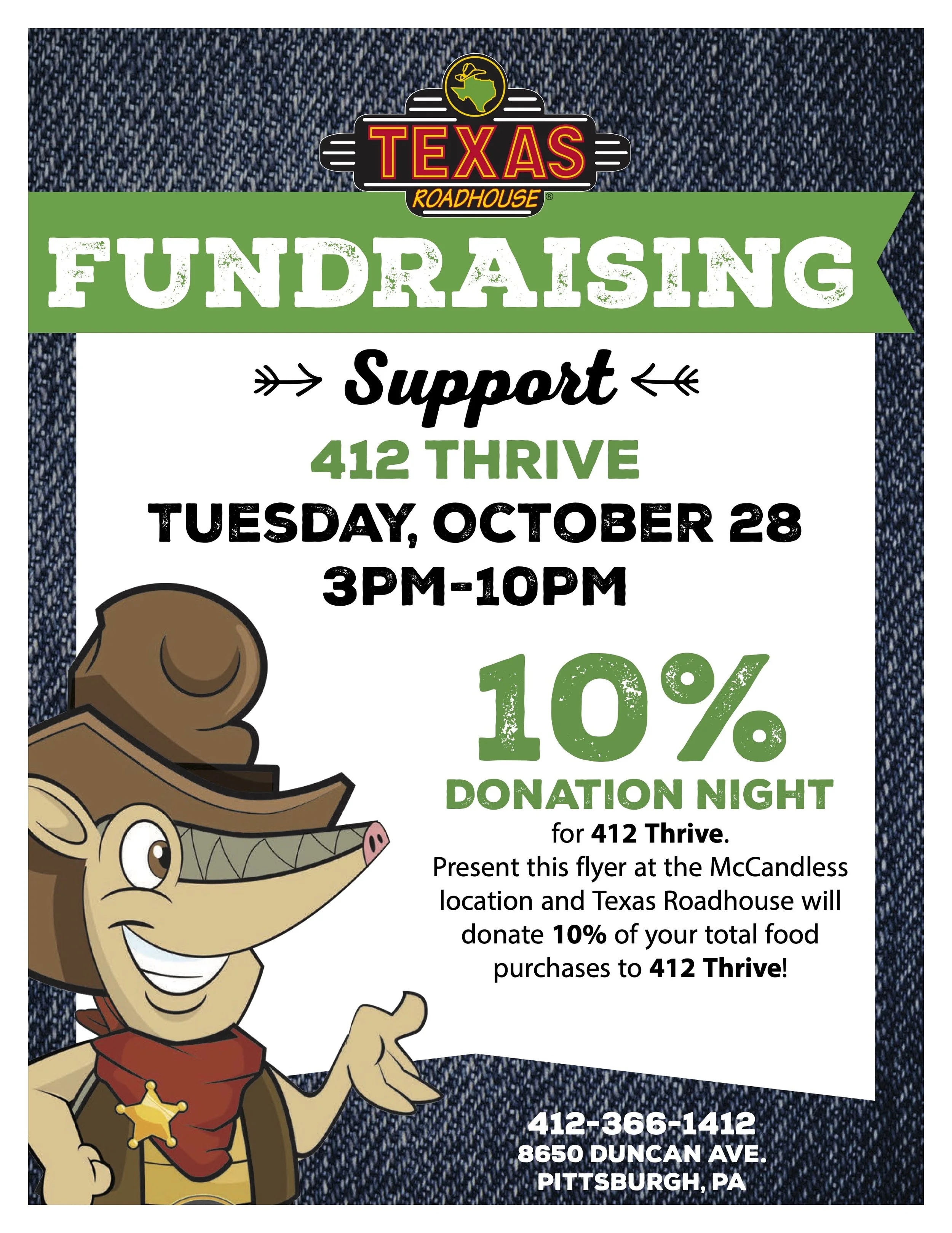 If your restaurant would like to participate in a fundraiser for 412Thrive, please email us at 412Thrive@412Thrive.org.